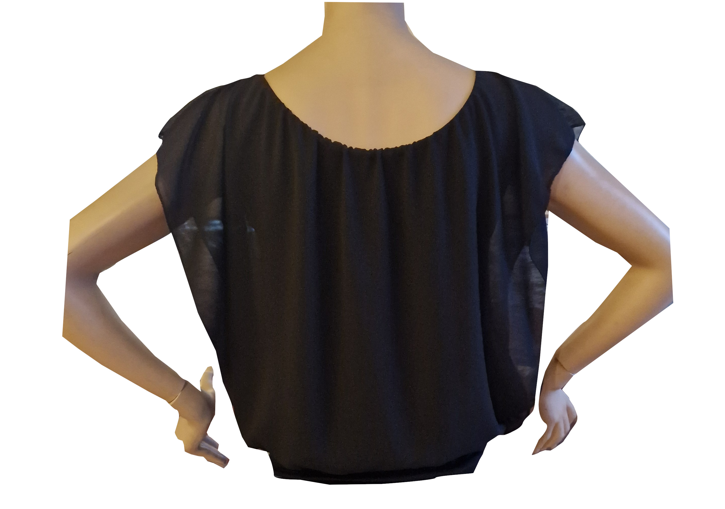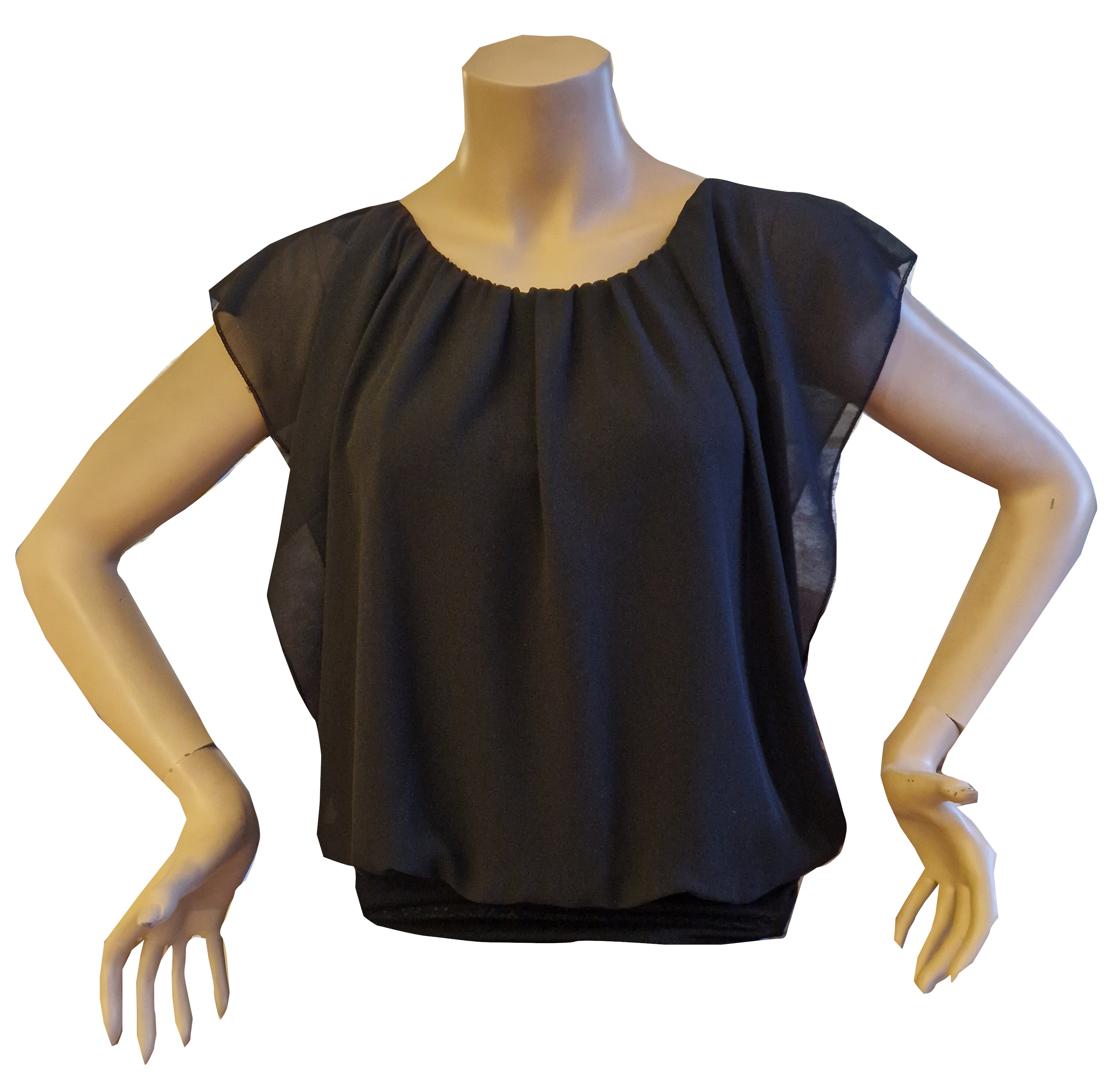 Oberteil mit überschnittenen Schultern, schwarz, blusig, leger,geeignet für Training und Einsteigerturniere, Obermaterial transparent, Futter blickdicht.